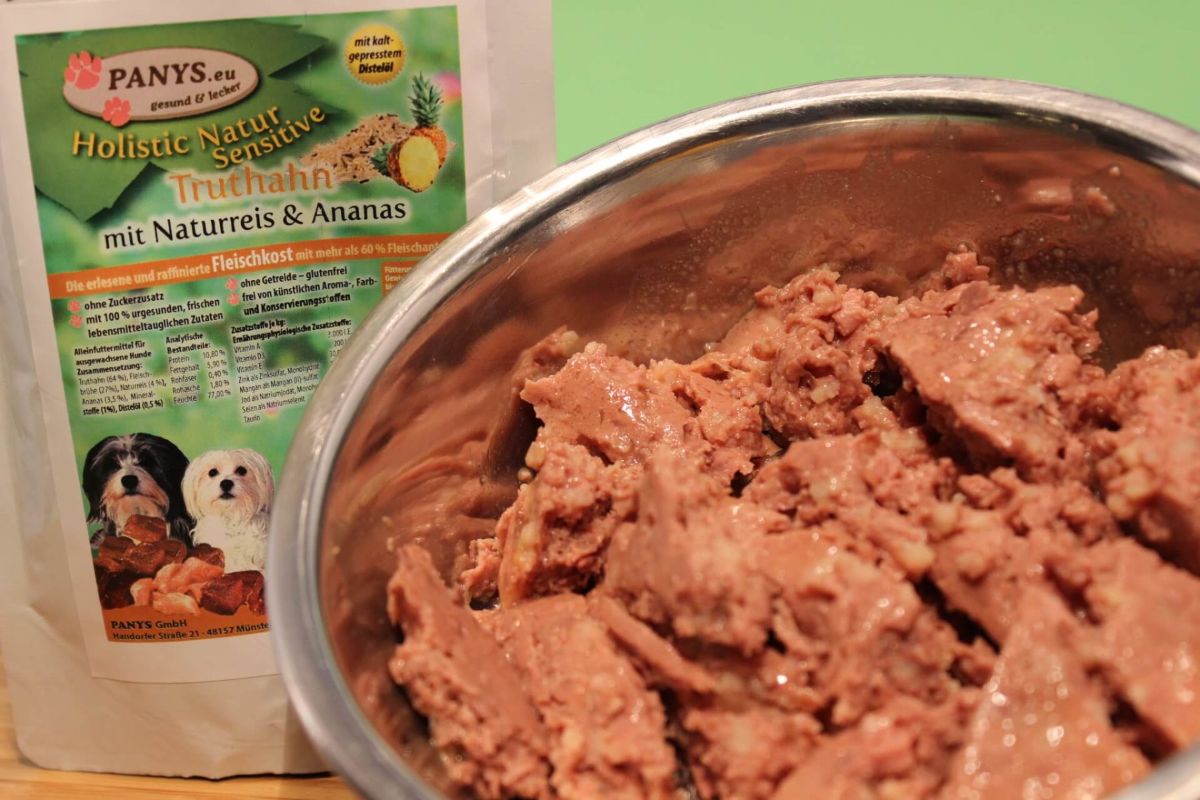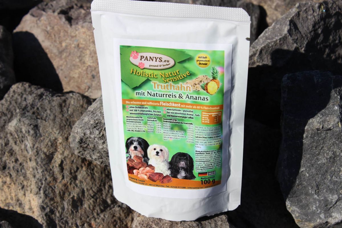 mit Singleprotein-Rezeptur Truthahn. Also super für alle Hunde geeignet, die Probleme mit rotem Fleischoder Gluten haben. Dieses Menü ist ein Alleinfutter für ausgewachsene Hunde. Mit 4,0 % Reis als Kohlenhydrat gehört auch dieses Menü zu den glutenfreien Rezepturen. 3,5 % Ananas regt die Eiweiß- und Fettverdauung an und unterstützt einen gesunden Stoffwechsel. Natürlich dürfen auch hier Mineralstoffe und Distelöl nicht fehlen.