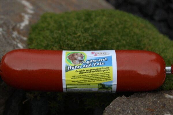 | Die Jagdwurst ist eine Fleischmahlzeit mit 70,0 % Fleischanteil - nur Geflügel. Auch hier wieder eine glutenfreie Rezeptur! Ideal für alle Hunde, die Rind, Lamm oder Wildsorten nicht gut vertragen. Hergestellt in Deutschland nach Lebensmittelstandard und natürlich ohne künstliche Aroma- und Farbstoffe. Dieses Gericht ist für alle ausgewachsenen Hunde als Alleinnahrung geeignet. Auch Welpen im Alter ab 3 Mon. dürfen auf 4-5 Mahlzeiten verteilt schon die PANYS Wurst bekommen. Allerdings ist hier zu beachten, dass Welpen während des Wachstums einen höheren Bedarf an Kohlenhydraten haben und Sie aus diesem Grund zusätzlich Welpen-Trockennahrung füttern sollten. |