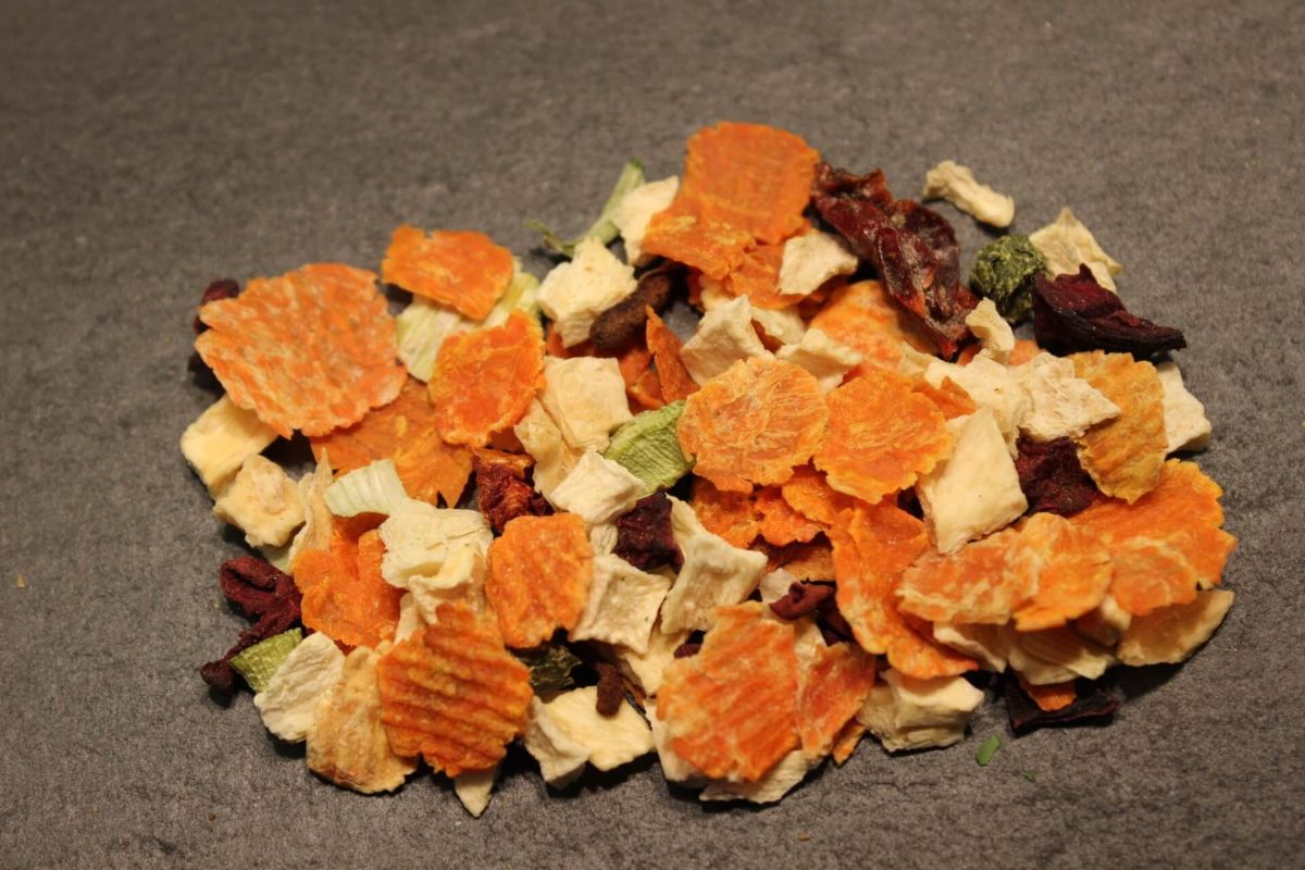 Möhrenflocken getrocknet, Sellerie getrocknet, Rote Beete getrocknet, Erbsenflocken getrocknet, Luzerne getrocknet, Spinat getrocknet, Tomaten getrocknet, Zucchini getrocknet, Paprika getrocknet, Lauch getrocknet